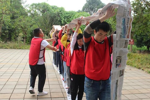 鐵甲戰(zhàn)車項目簡介:團隊所有成員利用指定道具制作一條可以容納所有隊員的大型履帶,然后全體隊員同時站在履帶內部統(tǒng)一行進,在履帶不能斷裂的情況下通過指定距離。只有報紙、小剪刀和膠布,在規(guī)定的時間內完成運載履帶的制作,并把所有人員通過履帶轉移的安全地帶。時間緊迫,人員的分工、協(xié)作,資源整合、監(jiān)督、激勵機制等對完成任務是必不可少的。通過一起參與,共同配合、親手制作履帶,體驗成功的喜悅!