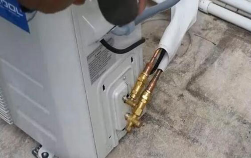 B、將室外機上的高壓閥黃銅六角形閥蓋打開,用內(nèi)六角板手將高壓閥門關(guān)閉。此時空調(diào)機仍在運行,因為高壓閥門已被關(guān)閉,所以制冷液不能再經(jīng)高壓閥門流到室內(nèi)機進行熱交換,而被壓縮進了室外機組內(nèi)。在空調(diào)運行約3-5分。
