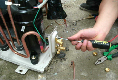 2.檢查空調(diào)的漏氟點(diǎn),如果有要及時(shí)焊補(bǔ)好,再開(kāi)啟壓縮機(jī)和真空泵,使管路內(nèi)的空氣邊循環(huán)抽真空。