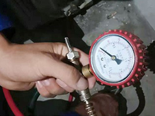 3、測壓加氟。充氟過程中我們需要時(shí)刻觀察壓力表指針變化。夏天觀察低壓壓力,環(huán)境溫度32攝氏度左右時(shí),壓力控制在0.45MP左右;冬天觀察制熱時(shí)的高壓壓力,壓力穩(wěn)定后控制在1.7MP左右。