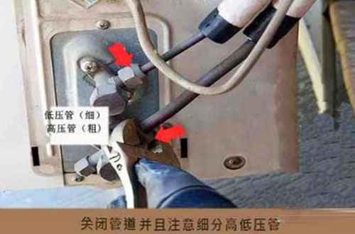 2.回收制冷劑。把空調(diào)器中的制冷劑收集到空調(diào)室外機(jī)中。在空調(diào)制冷正常的情況下,空調(diào)維修師傅用扳手?jǐn)Q下外機(jī)的液體管與氣體管接口上的保帽,關(guān)閉高壓管(細(xì))的截止閥門,幾分后管外表結(jié) 露,立即關(guān)閉低壓管(粗)截止閥門,同的迅速關(guān)機(jī),拔下電源插頭,用扳手?jǐn)Q緊保險帽。