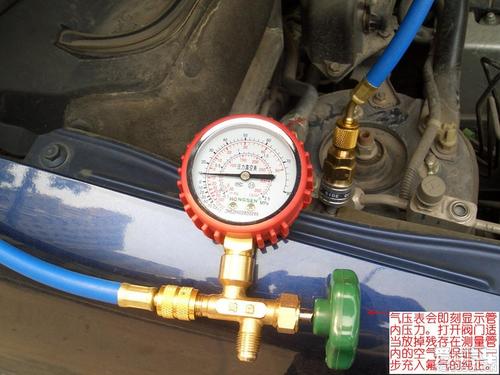 3、將空調(diào)設(shè)定制冷模式,并啟動運(yùn)轉(zhuǎn)。倒置氟制冷劑鋼瓶,開啟瓶閥,讓制冷劑由低壓閥處吸入空調(diào)系統(tǒng),控制加液表伐,還要注意加液不要太急(夏季低壓壓力不要超過0.4-0.5mpa)完成加氟操作。